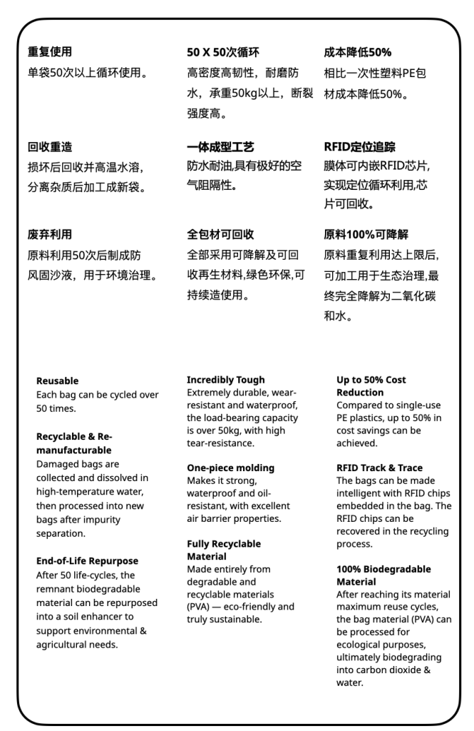 我们的研发团队创新研发了一种高强度且易于回收的新型材料。其卓越的耐用性和防水性能使其在快递包装袋、吨袋等多种应用场景中表现卓越。当材料出现磨损时,仅需在100℃热水中即可完成循环再生。该材料可重复使用50次,最终降解后还可作为土壤改良剂使用。其基础原料采用亲水性可降解材质,对环境十分友好。